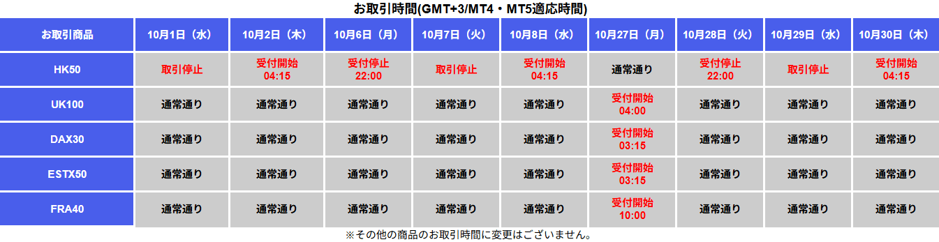 2025年10月の祝日に伴い、一部商品の取引時間が変更となります。