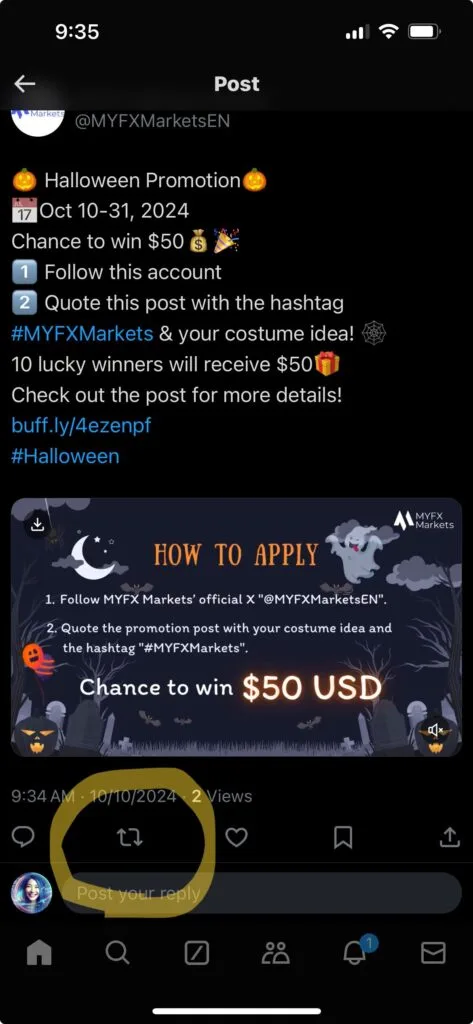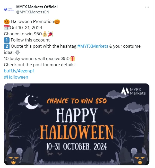 Simply follow MYFX Markets’ official X (formerly Twitter) account and quote post your costume idea and the hashtag "#MYFXMarkets" for a chance to win $50 USD! Ten lucky winners will be selected!