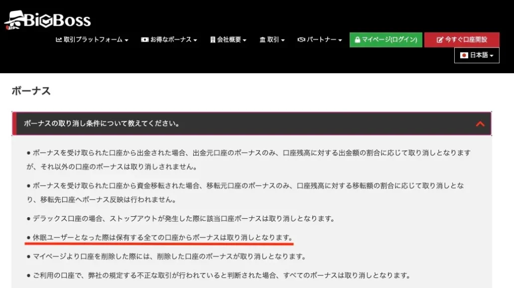 実際にBigBoss公式サイトでは、休眠口座・口座凍結になるとボーナスは全て取り消しになると説明されています。