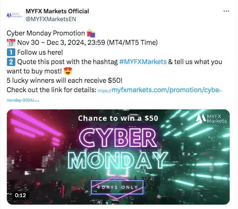 Get ready for Cyber Monday at MYFX Markets! We're thrilled to offer a special promotion where you could win $50 USD (or equivalent currency)!
