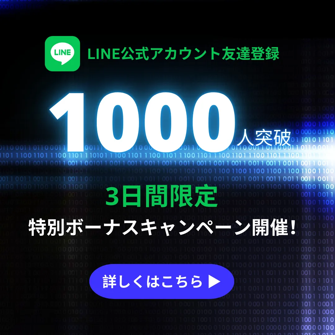 当社のLINE公式アカウントの友だち登録者数が1,000人を突破したことを記念し、キャンペーン期間中に10,000円以上ご入金いただいたお客様に、もれなく3,000円のトレードボーナスをプレゼントいたします🎉