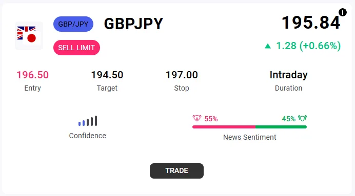 What is Signal Centre?Signal Centre is an analytics tool accessible through the MYFX Markets MT4/MT5 platforms or via the Client Office. It provides up to 50 daily trading signals across various markets, including forex, indices, commodities, and cryptocurrencies.Download for MT4/5Join on TelegramJoin on DiscordThese trade ideas are supplied by Acuity Research Limited, an FCA-authorised and regulated firm (Company Number 07428345).Personalise your insightsFilter trading signals by asset class, trade action and confidence level, and tailor your dashboard to match your unique trading style and risk tolerance.Stay Ahead with Key Economic Insights!Track major economic events and navigate market volatility with strategic trade planning.Keep One Step AheadStay ahead of the market with up to 50 trading signals, refreshed every hour so you're always ready when the market opens.Gain Comprehensive InsightsTake advantage of each signal's comprehensive trading plan, featuring exact entry, exit, and stop-loss levels for confident decision-making.Download for MT4/5Join on TelegramJoin on DiscordHow to get instant access to the MYFX Signal Centre?Simply jump into our Telegram or Discord to see our free signals, and then upgrade to premium via the MYFX Bot. You can also find the signals from within your CO if you're already a MYFX user. Join on Telegram Join on DiscordSome of our latest signalsKey Features of MYFX Markets Signals CentreEnhance your trading edge with MYFX Markets by gaining real-time insights to spot opportunities as they unfold. Instantly access a rich pool of news and data, providing a clear, comprehensive view of current market sentiment—all within an intuitive, user-friendly platform.Optimised Risk/Reward RatiosEach trade idea features risk/reward ratios up to 5:1, offering substantial profit potential.Consistent Signal FlowGet up to 50 trade ideas daily across three global time zones, ensuring continuous profit opportunities.Confidence in Every SignalChoose confidently with each signal, backed by technical analysis and real-time market sentiment indicators.Insight-Driven TradingTrade with precision using signals supported by expert analysis, support levels, and live news insights.Instant Execution PrecisionTake action immediately with single-click execution and filter signals by instrument, order type, or confidence level.Comprehensive Market CoverageAccess powerful signals across all essential financial instruments, including Forex, stocks, commodities, indices, and crypto.Ready to Start Trading?Open an account in 3 minutes and receive your login details instantly.Try Demo for FreeStart Trading